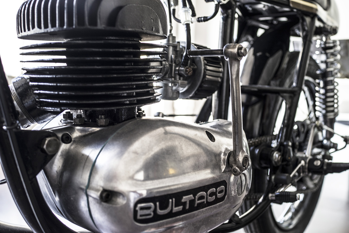 Para ello, solo había una solución: mantener el máximo de elementos posibles de origen, lo que terminó provocando una restauración profunda. Se mantiene el motor de origen, la horquilla delantera con los muelles a la vista y el freno delantero pero el deposito, siendo de Bultaco no es de la Mercurio, sino de la 'Tralla Super Sport', que junto con el colín artesanal y el asiento tapizado en piel, dan un aspecto muy racing, me gusta, sobre todo con esos puños y las manetas de origen.
