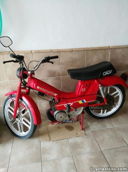 Mobylette Cady E-14. Color rojo. Funcionando y matriculada con placa amarilla. Todo de origen. LLantas de aleación color blanco. Muy cuidada y bien conservada. Documentación al día a falta de ITV. Necesitaría pequeño repaso mecánico. Conservo cesta delantera y transportin trasero.