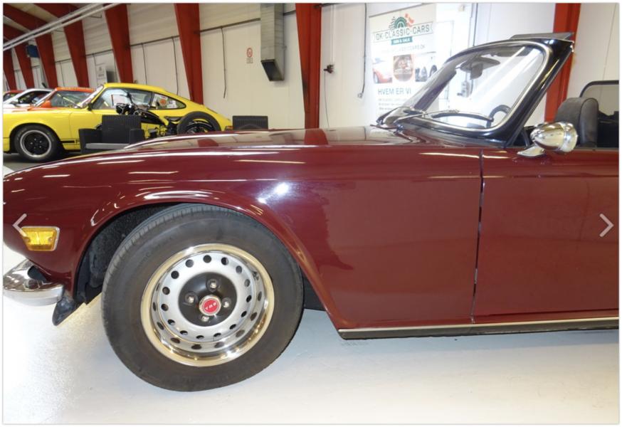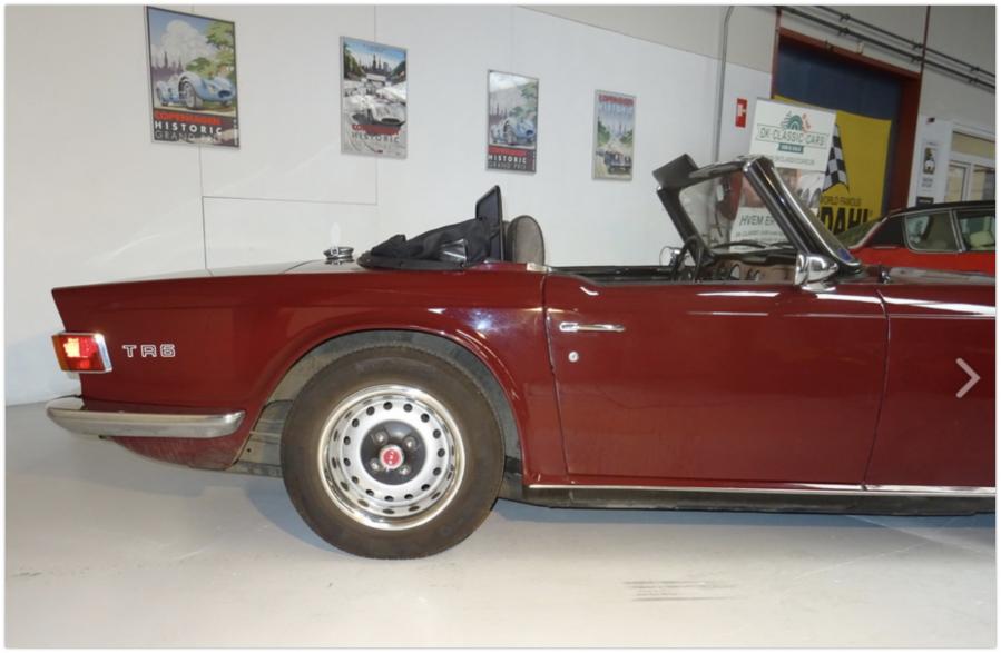Triumph TR6 original de 1971 con motor de fábrica de 2,5 litros y transmisión manual de 4 velocidades. El coche se presenta muy bien tanto estética como mecánicamente. No hay señales de accidentes anteriores, reparación de óxido o daños en el automóvil. El automóvil tiene un sistema de encendido y escape mejorado y arranca y se detiene como debería, un automóvil que se puede disfrutar como está durante muchos años. Varias piezas de repuesto, incluido el parabrisas adicional, la tapa de válvulas y el portaequipajes, se incluyen en las ventas. El coche se importó a Dinamarca en 1991 y ha tenido dos propietarios daneses anteriores. El último propietario danés ha tenido el automóvil desde julio de 2008. El automóvil tiene un título y registro daneses.