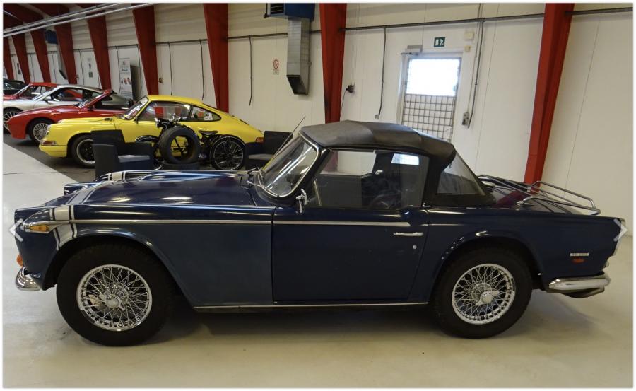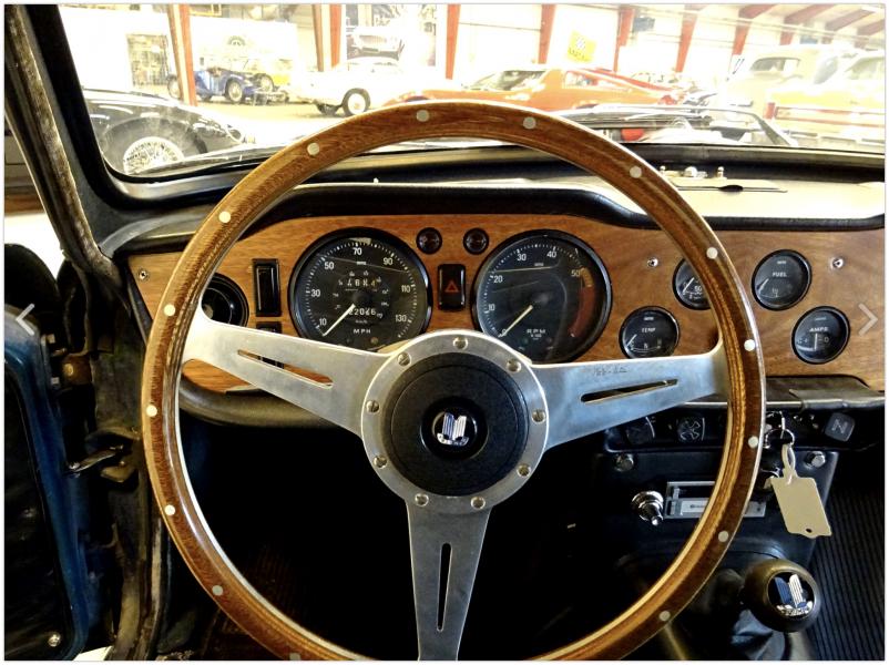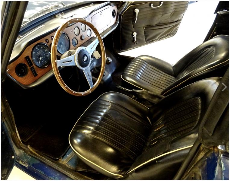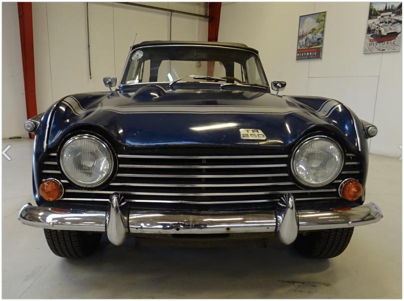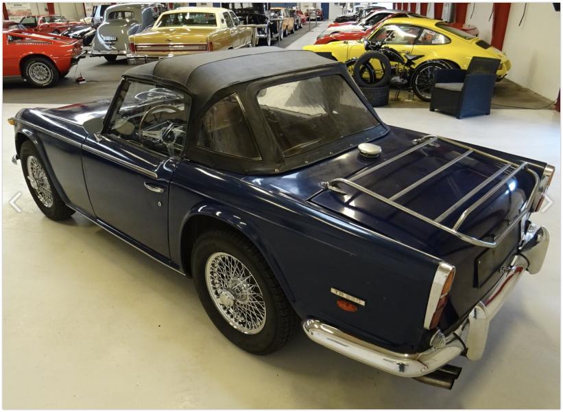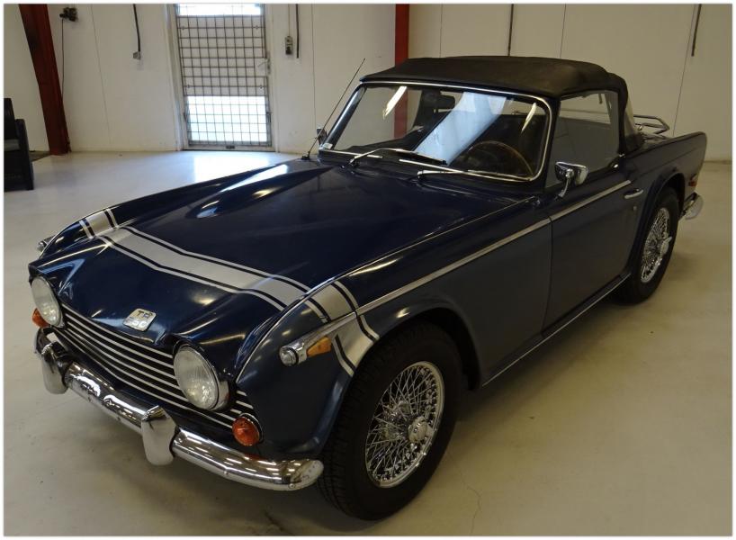1968 Triumph TR250 en el atractivo azul Valencia con interior de cuero negro. El automóvil tiene un motor de seis cilindros en línea de 2.5 litros con carburadores y una transmisión manual de 4 velocidades. El vehículo está en una condición de conducción diaria, pero necesita un poco de trabajo para llevarlo al siguiente nivel, pero se presenta muy bien y sin problemas mecánicos. Un certificado de herencia de confianza de British Motor Industry Trust incluido en la venta confirma el color y las opciones de fábrica, las fechas de montaje / envío y el nombre del concesionario de Los Ángeles que recibe el automóvil. Dos motores (número de motor TR6 CF21355VF y números coincidentes TR250 CD / 404-E) y las ruedas originales están incluidas en el precio.