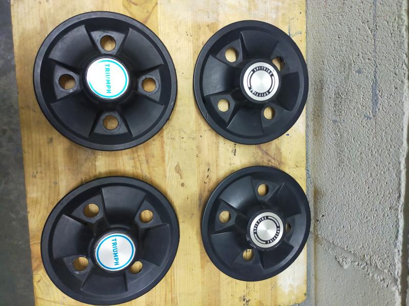 4 tapacubos embellecedores con los muelles tensores para llanta chapa de Triumph Spitfire 1500, en perfecto estado...