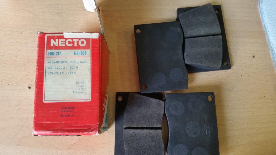 Se venden juegos de pastillas de freno delanteras para Fiat 1500L, 1600s, 1800b, 2300, 2300s coupe, Dino 2000 coupe/ spider. Ferrari 206s, 246 Dino. Alfa Romeo 1300, 1600. Volvo 121, 122s... Son nuevas a estrenar en perfecto estado