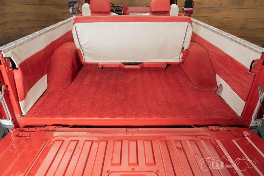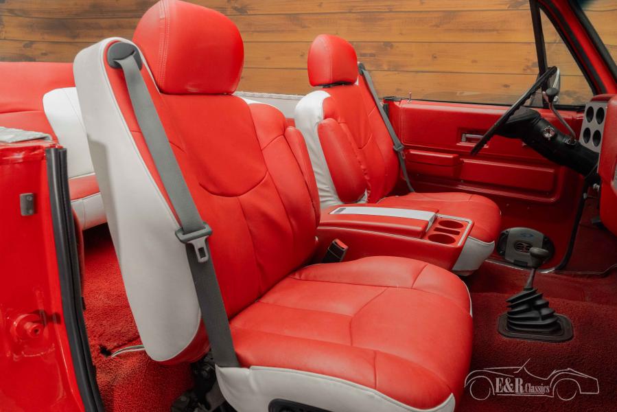 The Chevrolet Blazer K5 Cabriolet that we offer for sale here is in good condition, both optically and technically, with some minor signs of wear here and there. It has a beautiful red and white two-tone paint, which gives this impressive classic a distinct character. The interior has been renovated in the past and has two-tone artificial leather upholstery, electrically adjustable seats and a digital dashboard. The Blazer comes with a hard top and a soft top.