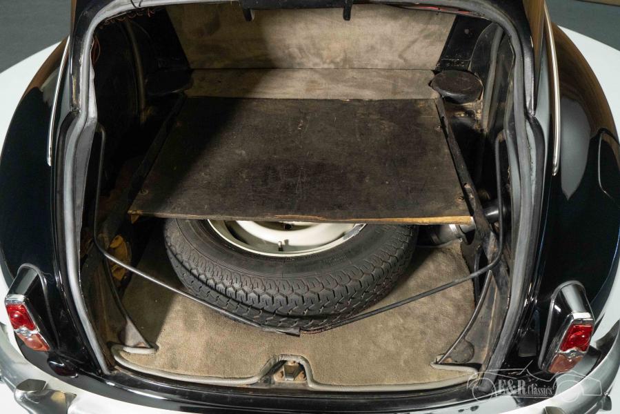 El exterior de este Peugeot 203 C luce una elegante pintura negra que brilla con luz propia y se integra a la perfección con el diseño atemporal del coche. Las clásicas llantas de acero con tapacubos cromados realzan su carácter original, mientras que las molduras y la parrilla irradian una sutil elegancia. En el interior, encontrará un interior sorprendentemente espacioso con dos cómodos asientos tipo sofá, tapizados en tela gris con un delicado estampado que combina a la perfección con el salpicadero, y un gran volante con detalles en color marfil. El Peugeot también está equipado con un techo corredizo para que pueda disfrutar del aire fresco mientras viaja.