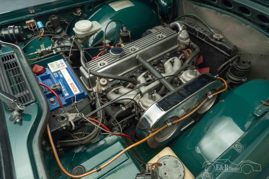 The TR6’s body is finished in its original color, Mallard Green — a deep, classic shade that perfectly matches its sporty character. The car comes with both a black soft top and a matching hard top, making it suitable for all seasons. The black steel wheels give it a bold look that contrasts beautifully with the paintwork. Inside, you’ll find luxurious black seats that harmonize perfectly with the wooden dashboard and chrome details. The interior exudes British class and pairs stylishly with the exterior — a combination that makes this TR6 a timeless classic.