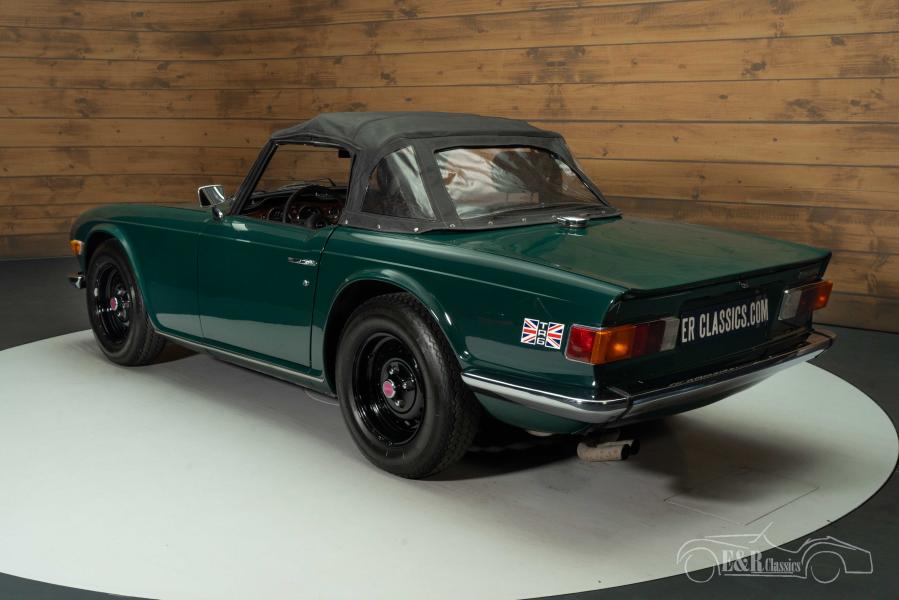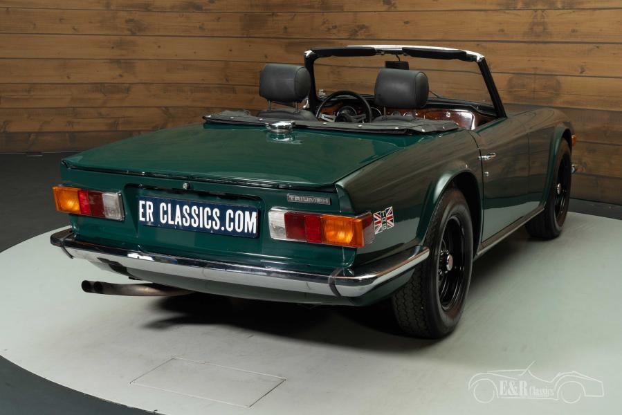 La carrocería del TR6 luce su color original, Mallard Green, un tono clásico e intenso que combina a la perfección con su carácter deportivo. El coche incluye una capota de lona negra y una capota rígida a juego, lo que lo hace ideal para cualquier época del año. Las llantas de acero negras le confieren un aspecto audaz que contrasta a la perfección con la pintura. En el interior, encontrará lujosos asientos negros que armonizan a la perfección con el salpicadero de madera y los detalles cromados. El interior rezuma clase británica y combina a la perfección con el exterior: una combinación que convierte a este TR6 en un clásico atemporal.