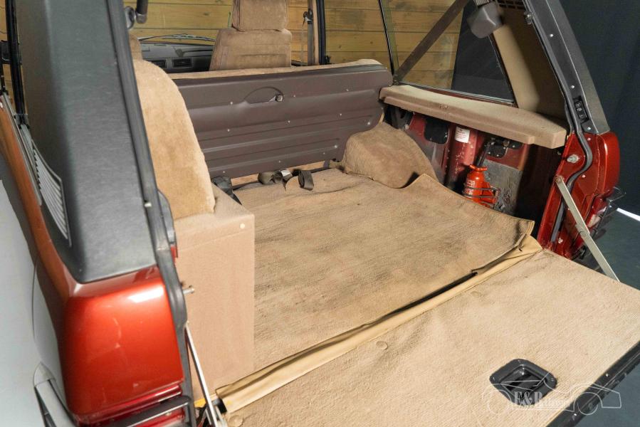The exterior of this Range Rover immediately catches the eye with its bronze/orange metallic paintwork, which contrasts beautifully with the classic design elements of this model. The original alloy wheels and black accents emphasize its tough and timeless appearance. The interior is equipped with a beige-coloured fabric interior, which creates a stylish and warm ambiance. The beautiful original dashboard has been preserved, which enhances the authentic appearance of this classic. Together, the interior and exterior form a beautiful whole, perfect for both lovers of classic off-road vehicles and collectors of exclusive vehicles.