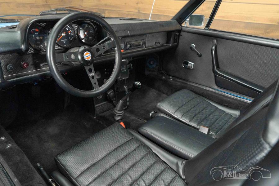 The appearance of this Porsche 914 is a real eye-catcher thanks to the striking Gulf blue paintwork with orange accents, inspired by the legendary Le Mans racing cars. The black Fuchs-style rims give the car a sporty look that perfectly matches its heritage. The removable Targa roof ensures an open driving experience on sunny days. The interior is also taken care of down to the last detail: black sports seats, a sports steering wheel with Gulf logo and a sleekly finished dashboard provide a cockpit feeling that fits perfectly with the rest of the design. The combination of the interior and exterior exudes pure motorsport and makes this Porsche 914 a unique appearance.