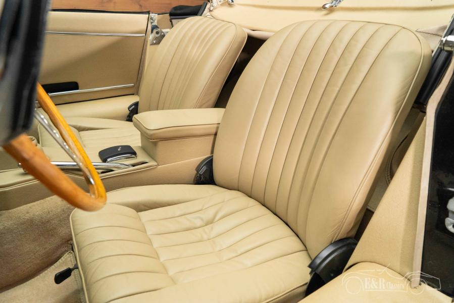 La carrocería está pintada en negro intenso, lo que contrasta a la perfección con los detalles cromados y las impresionantes llantas de radios cromados. La capota de lona negra luce elegante tanto abierta como cerrada, mientras que el interior de cuero beige ofrece un ambiente cálido y lujoso. La combinación del elegante exterior y el luminoso interior le da al coche una sensación de exclusividad. El volante de madera y el salpicadero clásico completan el conjunto y subrayan la artesanía británica que hace tan especial a este E-Type.