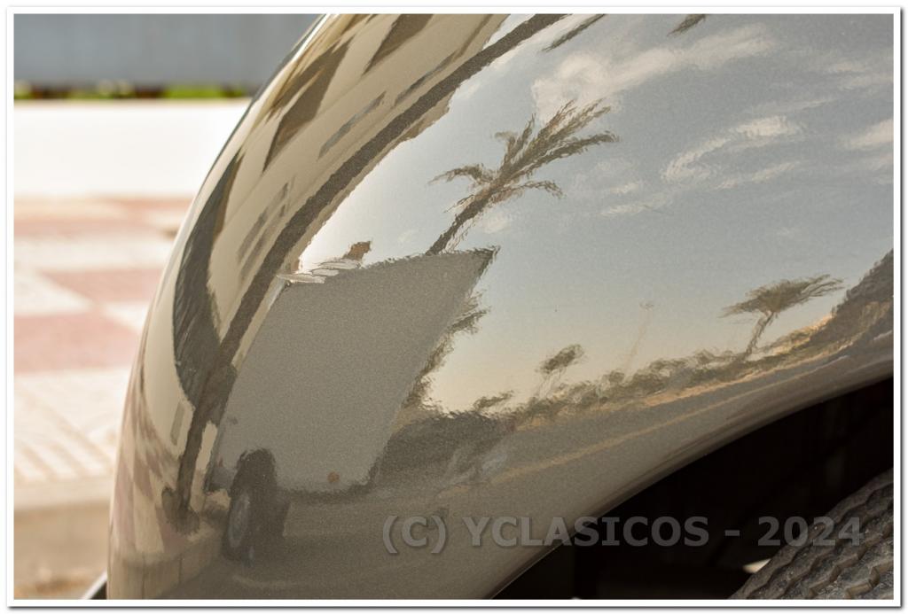 Aunque el coche está en excelente estado general, hay algunos detalles menores que se pueden mejorar para llevarlo a un 10. Como se muestra en las fotos, el lado izquierdo del capó y un lateral presentan ligeros impactos, posiblemente causados por pequeñas piedras. La pintura en un montante de la puerta y en un lateral necesita algo de corrección, al igual que los espejos retrovisores, que también podrían beneficiarse de un repaso de pintura. Algunas llantas podrían pulirse para recuperar su brillo original, y sería necesario pasar la ITV para su entrega al día.
