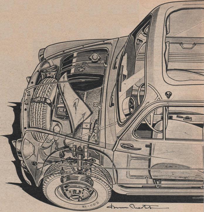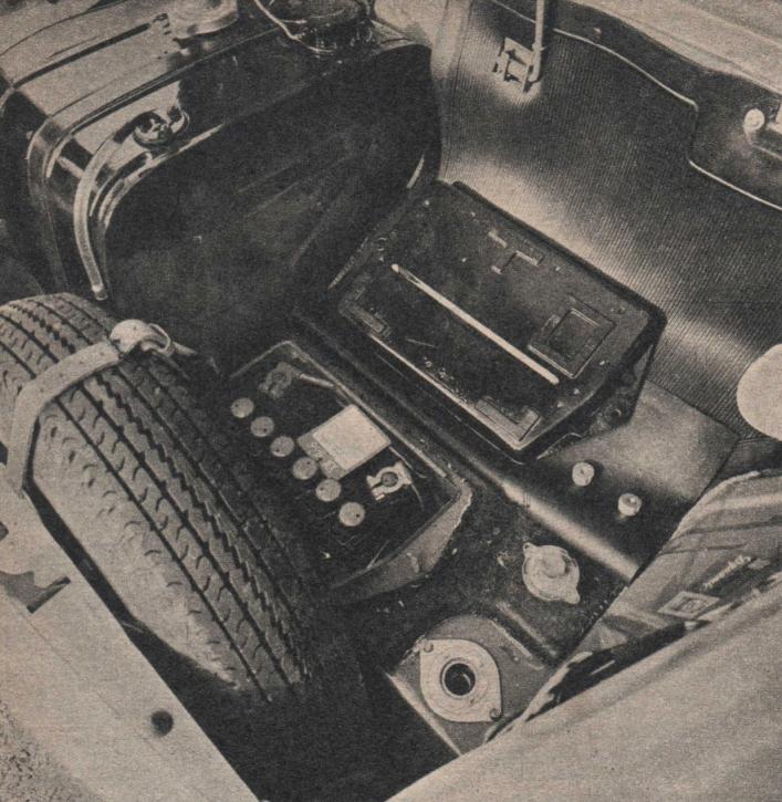 En el compartimiento anterior para equipajes, que se abre desde dentro por medio .de un tirante puesto a la izquierda bajo el tablero de instrumentos, está instalado el depósito de carburante. La operación de llenado es fácil, pero durante la misma puede ensuciarse él equipaje. Bajo el plano portaequipajes está colocada la batería y el depósito del líquido de frenos. Fácil el control de estos dos elementos.