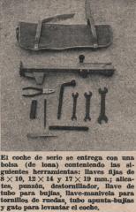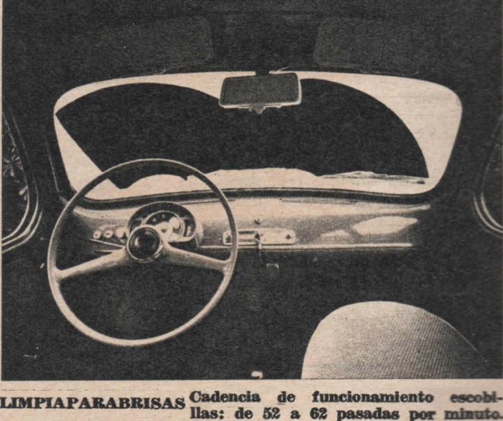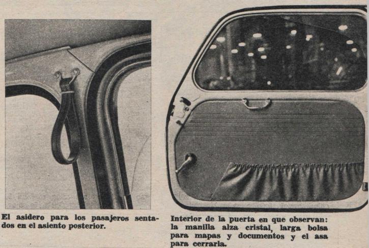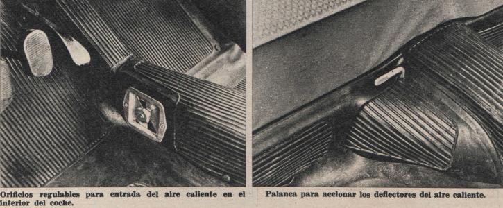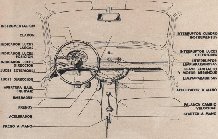 Sobre dicha llave está el interruptor de las luces de posición. A los lados, los interruptores para la iluminación de los instrumentos y la puesta en marcha del limpiaparabrisas. Bajo la plancha portainstrumentos se halla el mando del lavaparabrisas, fácil de accionar y que permite dosificar la cantidad de agua lanzada, así como el gas a mano que ya no es tan fácil de manejar por hallarse demasiado escondido. Encontramos que los pedales, especialmente el acelerador y el freno, están demasiado juntos. Además el ya indicado abultamiento de la plancha por la cavidad de la rueda, impide accionarlos con facilidad. Sobre el pequeño túnel del fondo, están instalados la palanca de cambio, el mando del «starter» y la palanca del freno a mano, ambos de manejo cómodo. En lo referente a los mandos para conectar la calefacción (pequeña palanca sobre el túnel, cerca del asiento posterior) y de distribución del aire caliente (orificios en los lados anteriores del túnel), su poco frecuente uso justifica su escasa facilidad de manejo.