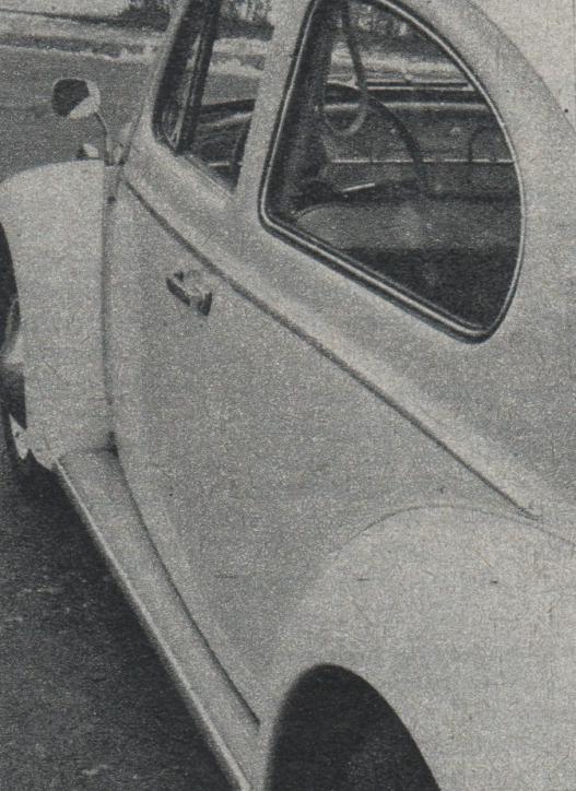 No es difícil comprender que la carrocería del Volkswagen ha sido diseñada hace más de 25 años. Muchos de sus elementos estéticos son característicos de 1930/1940. Nos referimos al baúl anterior en forma descendente; a los faros carenados formando parte del guardabarros; al parabrisas plano y, sobre todo, a los laterales discontinuos manteniendo todavía los memorables estribos, detalle que hoy día existe solamente en el Vokswagen entre todos los coches de turismo.