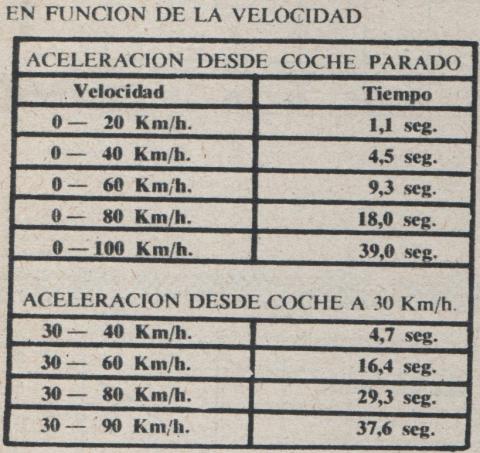 La curva inferior se refiere a la aceleración partiendo de coche parado, y con el uso del cambio. La superior, indica la aceleración en «cuarta» y partiendo de 30 Km/h. (33,312 Km/h.). Las velocidades Indicadas, son efectivas.