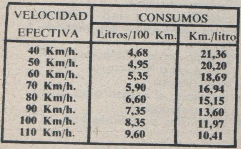 En carretera hemos observado que en 100 Km. de recorrido el consumo ha oscilado entre 7 y 10 1/2 litros. Por ello se puede calcular una media de 9 litros/100 km., lo que equivale a recorrer 11 km/litro.