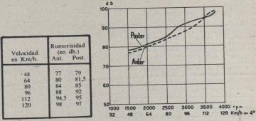 Mediante un fonómetro ha sido obtenida la rumorosidad en el interior del coche (asiento anterior y posterior), en carretera llana, recta y de buen firme. Cambio de velocidad en «cuarta».