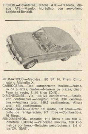 RENDIMIENTOS: Consumo, 11,6 litros a los 100 kilómetros (CUNA). Velocidad máxima. 180 kilómetros por hora. Relación peso/potencia, 8.4 ki-los/CV. (SAE).
