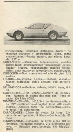 MOTOR: central; propulsión, trasera. Ciclo y género, 4 TG. Número de cilindros y disposición, 4 L. Diámetro, 78 milímetros, Carrera, 84 milímetros. Cilindrada, 1.605 centímetros cúbicos. Relación de compresión, 10,25:1. Potencia máxima, 127 CV. (DIN). Régimen máximo, 6.250 revoluciones por minuto. Par motor máximo, 15 mkg. (SAE), a 5.000 revoluciones por minuto. Disposición de válvulas, en cabeza, en V, de 40 grados. Arbol de levas y su mando, lateral, por cadena. Refrigerado por agua.