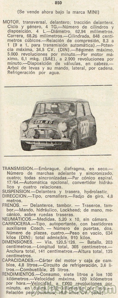 AUSTIN MINI 850 - Ficha Técnica de época 1972