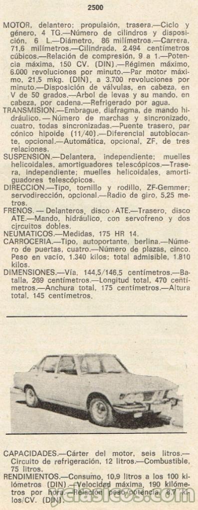 MOTOR: delantero: propulsión, trasera. Ciclo y género, 4 TG. Número de cilindros y disposición. 6 L. Diámetro. 86 milímetros.  Carrera. 71,6 milímetros. Cilindrada. 2.494 centímetros cúbicos. Relación de compresión, 9 a 1. Potencia máxima, 150 CV. (DIN). Régimen máximo, 6.000 revoluciones por minuto. Par motor máximo, 21,5 mkg. (DIN), a 3.700 revoluciones por minuto. Disposición de válvulas, en cabeza, en V de 50 grados. Arbol de levas y su mando, en cabeza, por cadena. Refrigerado por agua.