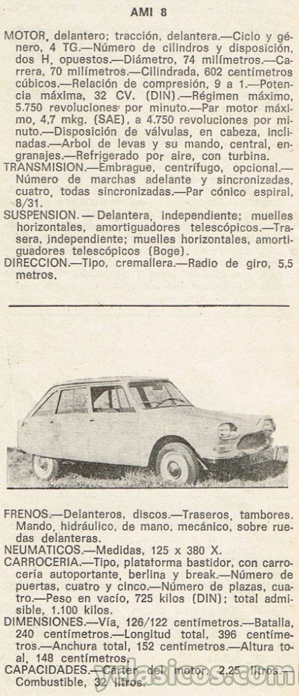 MOTOR: delantero; tracción, delantera. Ciclo y género, 4 TG. Número de cilindros y disposición, dos H, opuestos. Diámetro, 74 milímetros. Carrera, 70 milímetros. Cilindrada, 602 centímetros cúbicos. Relación de compresión, 9 a 1. Potencia máxima, 32 CV. (DIN). Régimen máximo, 5.750 revoluciones por minuto. Par motor máximo, 4,7 mkg. (SAE), a 4.750 revoluciones por minuto. Disposición de válvulas, en cabeza, inclinadas. Arbol de levas y su mando, central, engranajes. Refrigerado por aire, con turbina.