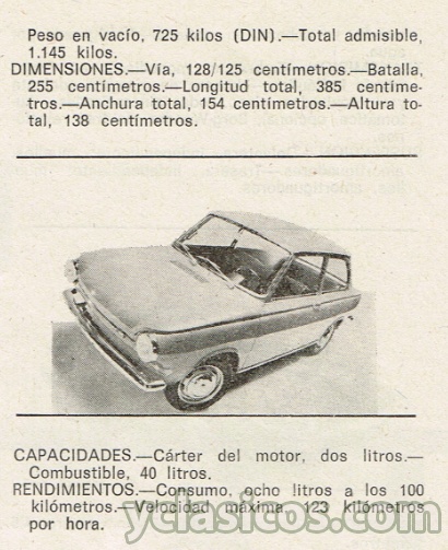 CARROCERIA: Tipo, autoportante, berlina. Número de puertas, dos. Número de plazas, cinco. Peso en vacío. 725 kilos (DIN). Total admisible, 1.145 kilos.