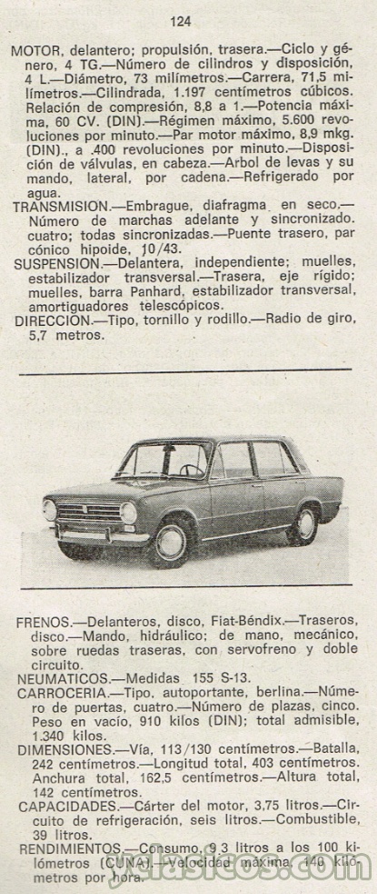 MOTOR: delantero; propulsión, trasera. Ciclo y género, 4 TG. Número de cilindros y disposición, 4 L. Diámetro, 73 milímetros. Carrera, 71,5 milímetros. Cilindrada, 1.197 centímetros cúbicos. Relación de compresión, 8,8 a 1. Potencia máxima, 60 CV. (DIN). Régimen máximo, 5.600 revoluciones por minuto. Par motor máximo, 8,9 mkg. (DIN)., a .400 revoluciones por minuto. Disposición de válvulas, en cabeza. Arbol de levas y su mando, lateral, por cadena. Refrigerado por agua.