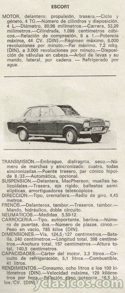MOTOR: delantero; propulsión, trasera. Ciclo y género, 4 TG. Número de cilindros y disposición. 4 L. Diámetro, 80,98 milímetros. Carrera. 53,29 milímetros. Cilindrada, 1.098 centímetros cúbicos. Relación de compresión, 8 a 1. Potencia máxima, 44 CV. (DIN). Régimen máximo, 6.000 revoluciones por minuto. Par máximo, 7,2 mkg. (DIN), a 3.000 revoluciones por minuto. Disposición de válvulas en cabeza. Arbol de levas y su mando, lateral, por cadena. Refrigerado por agua.