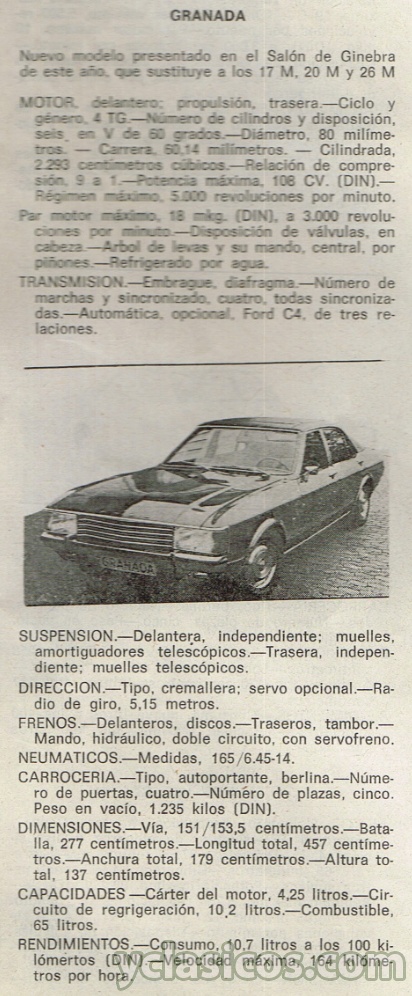 FORD GRANADA - Ficha Técnica de época 1972