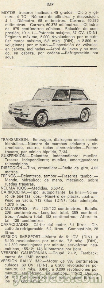 VERSION RALLY IMP: Motor de 998 centímetros cúbicos. 60 CV. (DIN), a 6.200 revoluciones por minuto: 8.1 mkg. (DIN), a 3.200 revoluciones por minuto: servofreno: neumáticos. 115-12 Dunlop SP 41: 152 kilómetros por hora: nueve litros a los 100 kilómetros.