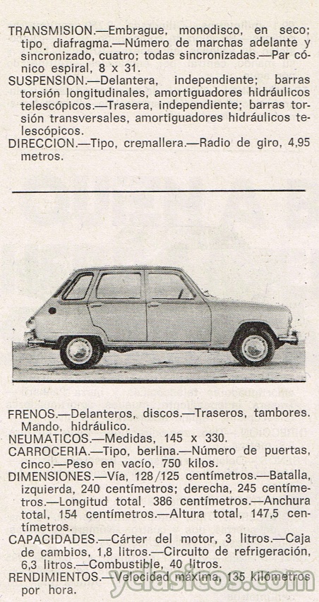 MOTOR: delantero; tracción delantera. Ciclo y género, 4 TG. Número de cilindros y disposición. 4 L. Diámetro, 70 milímetros. Carrera, 72 milímetros. Cilindrada. 1.108 centímetros cúbicos. Relación de compresión, 8,3 a 1. Potencia máxima. 45 CV. (DIN). Régimen máximo. 5.300 revoluciones por minuto. Par motor máximo. 7.7 mkg. (DIN), a 3.000 revoluciones por minuto. Disposición de válvulas, en cabeza. Arbol de levas y su mando, lateral; por cadena. Refrigeración por agua.