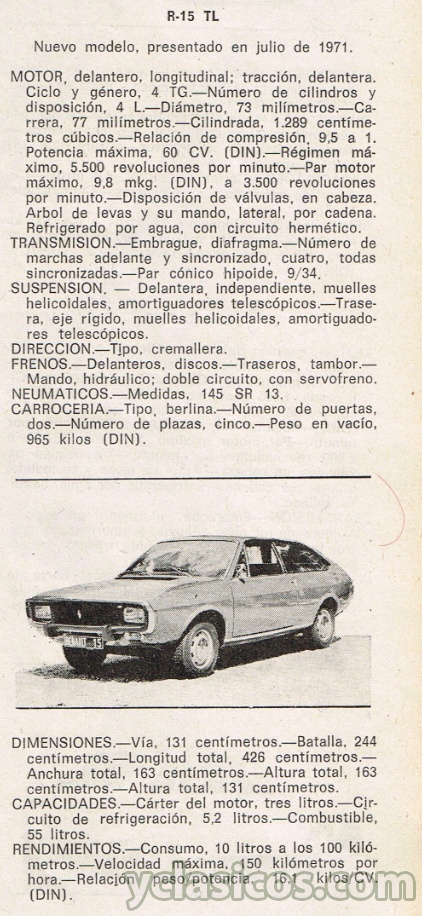 MOTOR,: delantero, longitudinal; tracción, delantera. Ciclo y género. 4 TG. Número de cilindros y disposición, 4 L. Diámetro, 73 milímetros. Carrera, 77 milímetros. Cilindrada. 1.289 centímetros cúbicos. Relación de compresión. 9,5 a 1. Potencia máxima. 60 CV. (DIN). Régimen máximo, 5.500 revoluciones por minuto. Par motor máximo. 9.8 mkg. (DIN), a 3.500 revoluciones por minuto. Disposición de válvulas, en cabeza. Arbol de levas y su mando, lateral, por cadena. Refrigerado por agua, con circuito hermético.