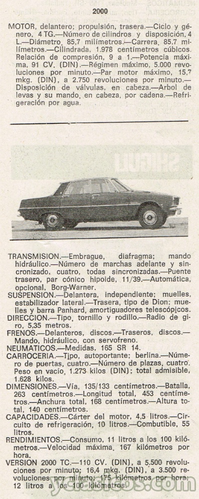 VERSION 2000 TC: 110 CV. (DIN), a 5.500 revoluciones por minuto; 16,4 mkg. (DIN), a 3.500 revoluciones por minuto; 175 kilómetros por hora; 12 litros a los 100 kilómetros.