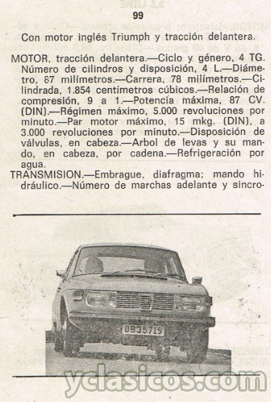 MOTOR: tracción delantera. Ciclo y género. 4 TG. Número de cilindros y disposición. 4 L. Diámetro. 87 milímetros. Carrera. 78 milímetros. Cilindrada, 1.854 centímetros cúbicos. Relación de compresión. 9 a 1. Potencia máxima. 87 CV. (DIN). Régimen máximo. 5.000 revoluciones por minuto. Par motor máximo, 15 mkg. (DIN), a 3.000 revoluciones por minuto. Disposición de válvulas, en cabeza. Arbol de levas y su mando, en cabeza, por cadena. Refrigeración por agua.