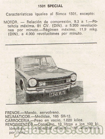 MOTOR: Relación de compresión, 9,3 a 1. Potencia máxima. 81 CV. (DIN), a 5.200 revoluciones por minuto. Régimen máximo. 11,9 mkg. (DIN), a 4.000 revoluciones por minuto.