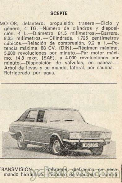 MOTOR: delantero; propulsión, trasera. Ciclo y género, 4 TG. Número de cilindros y disposición. 4 L. Diámetro. 81.5 milímetros. Carrera. 8.25 milímetros. Cilindrada, 1.725 centímetros cúbicos. Relación de compresión, 9.2 a 1. Potencia máxima. 88 CV. (DIN) . Régimen máximo, 5.200 revoluciones por minuto. Par motor máximo, 14,8 mkg. (SAE). a 4.000 revoluciones por minuto. Disposición de válvulas, en cabeza. Arbol de levas y su mando, lateral, por cadena. Refrigerado por agua.