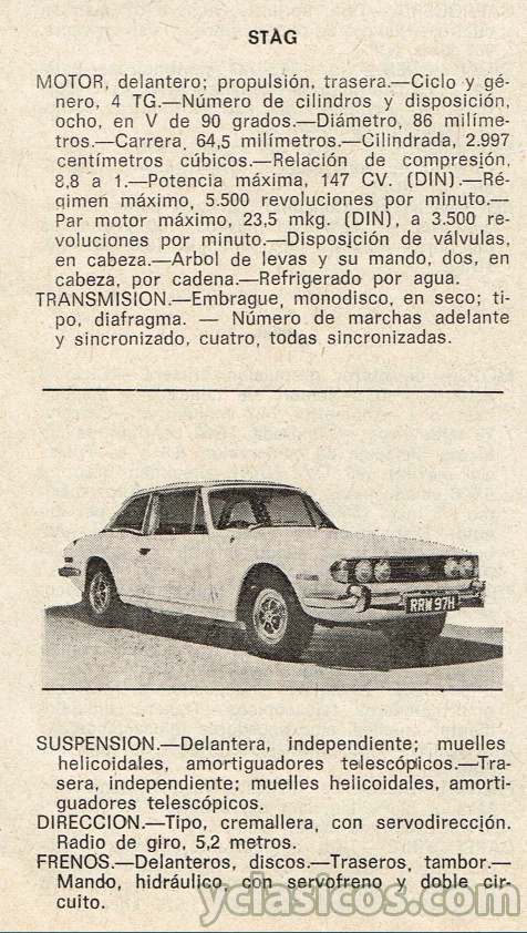 MOTOR: delantero; propulsión, trasera. Ciclo y género. 4 TG. Número de cilindros y disposición, ocho, en V de 90 grados. Diámetro, 86 milímetros. Carrera. 64,5 milímetros. Cilindrada, 2.997 centímetros cúbicos. Relación de compresión, 8.8 a 1. Potencia máxima, 147 CV. (DIN). Régimen máximo, 5.500 revoluciones por minuto. Par motor máximo, 23,5 mkg. (DIN), a 3.500 revoluciones por minuto. Disposición de válvulas, en cabeza. Arbol de levas y su mando, dos, en cabeza, por cadena. Refrigerado por agua.