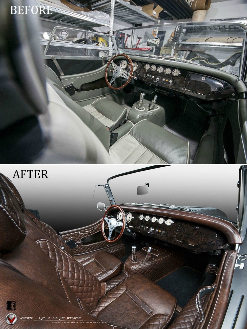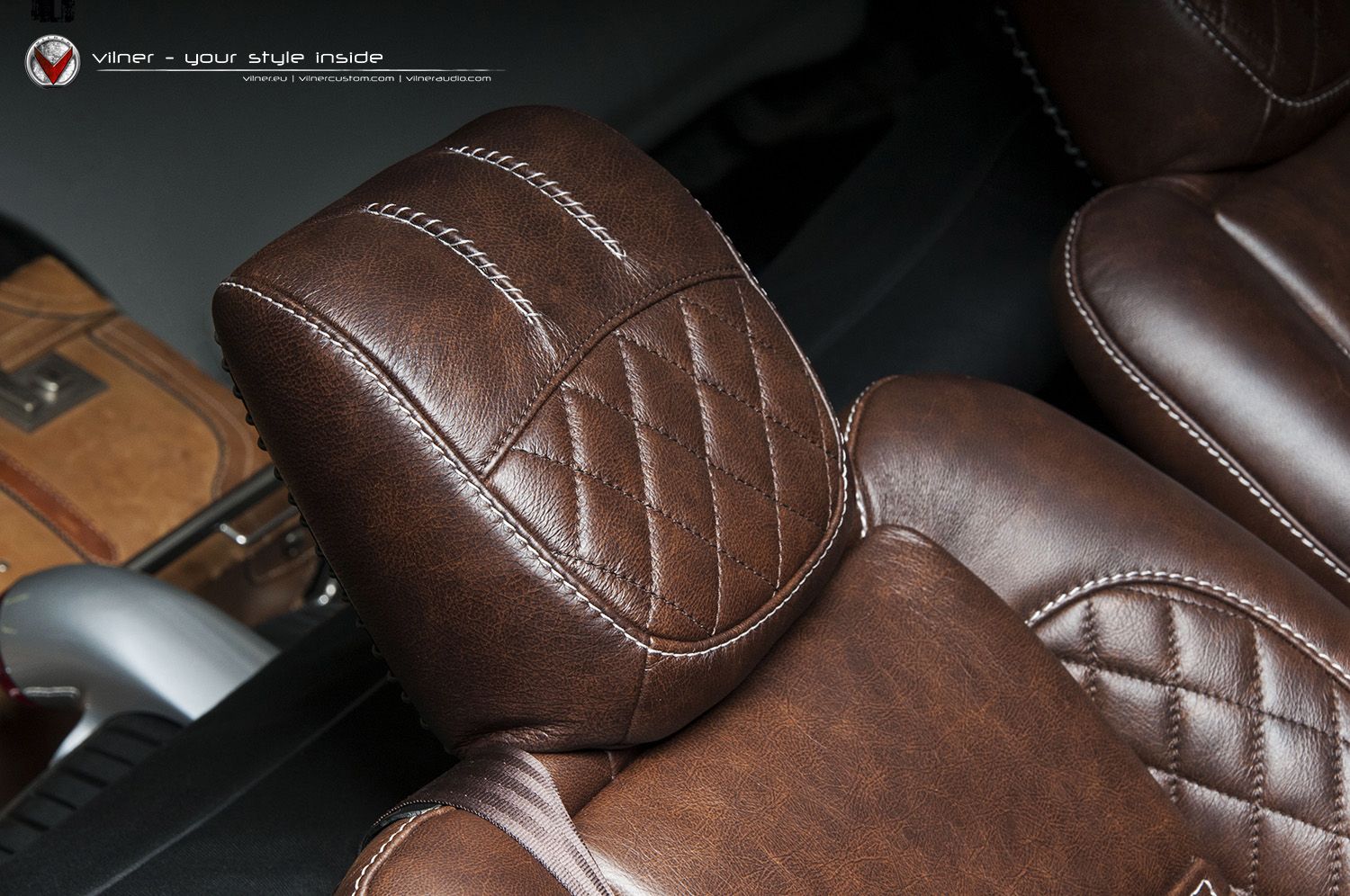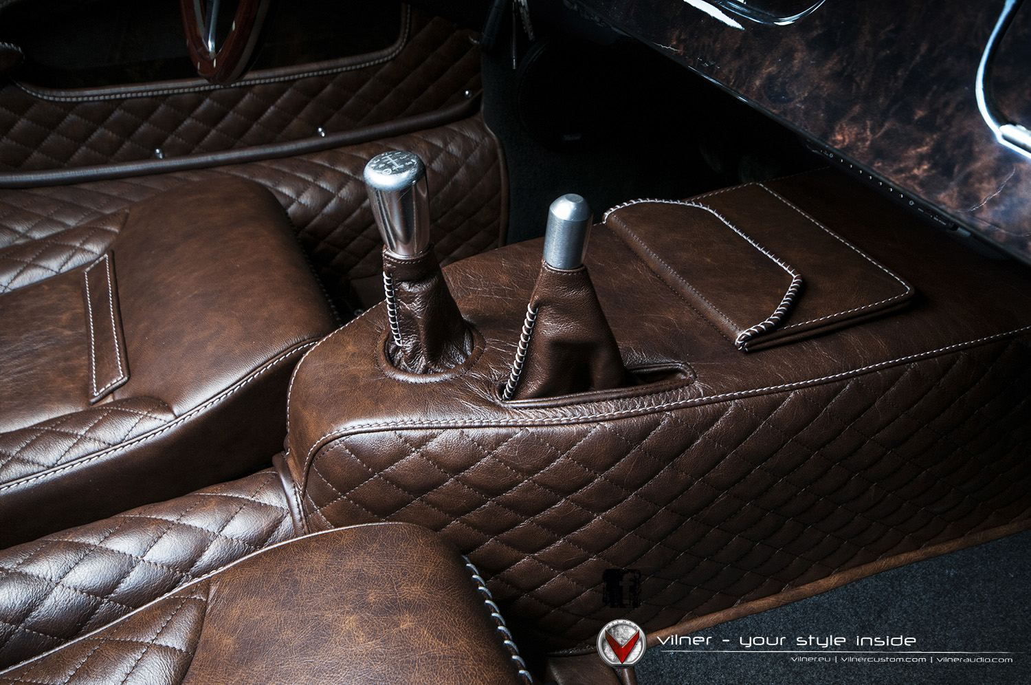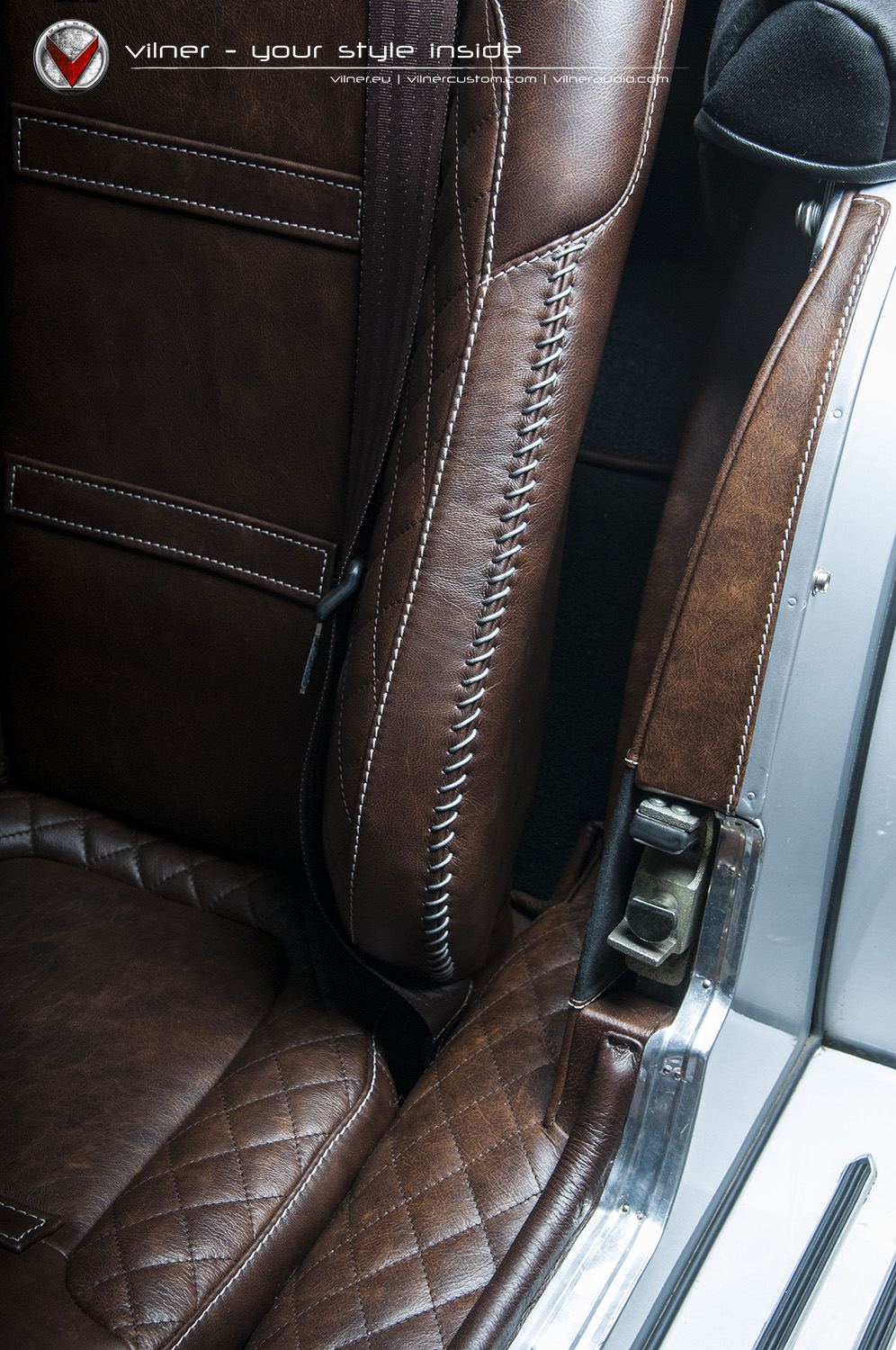 La tapicería lisa gris y blanca deja su lugar a un tapizado de piel marrón acolchada, que tanto gusta a los ingleses y que tanto emplea por ejemplo Bentley en sus modelos, con guateado de rombos en algunos lugares, así como costuras realizadas a mano con hilo blanco y tiras de cuero teñidas de color plata. Se ha tapizado incluso los cierres de los cinturones de seguridad y los sistemas de cierre de las puertas, que se encontraban totalmente a la vista, ahora están cubiertos de Alcántara de color negro. Vilner ha cambiado incluso todos los tornillos que están a la vista por un nuevo juego con cabezas brillantes para que hicieran juego con los radios del volante.
