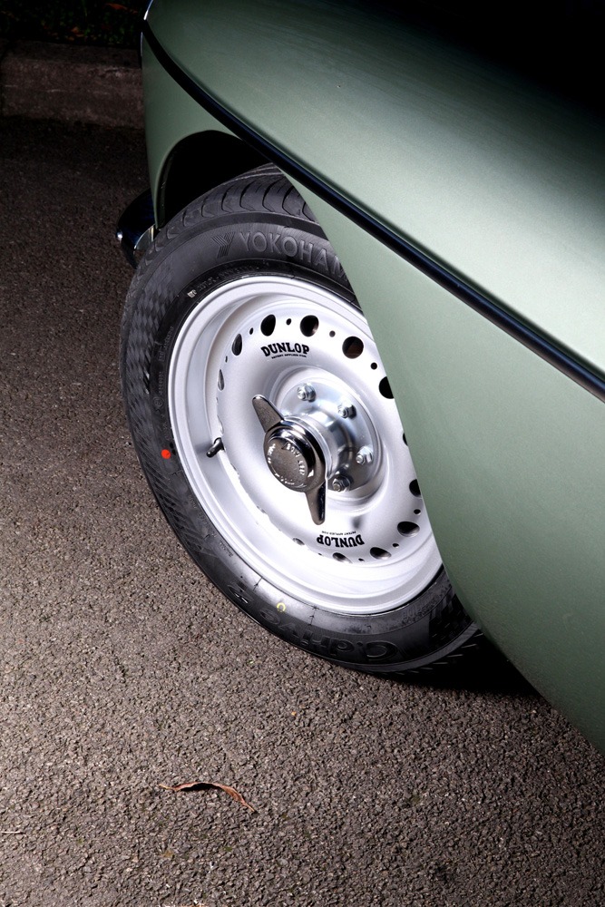 También se ha realizado desde cero el habitáculo, con un nuevo salpicadero con instrumentación Smith y un volante original del MGB-GT, acompañado de nuevos asientos tipi 'bucket' aunque de estilo retro, sin reposacabezas. El tapizado es de Alcántara y el resultado, sobresaliente. Por supuesto, el equipo de audio 'tope de gama' y las conexiones auxiliares están todas presentes. Por si fuera poco, se ha insonorizado todo el habitáculo usando 'Dinamat', algo que no me termina de convencer por completo pues el mayor mal que tienen los coches modernos ese justamente ese, que están excesivamente aislados.