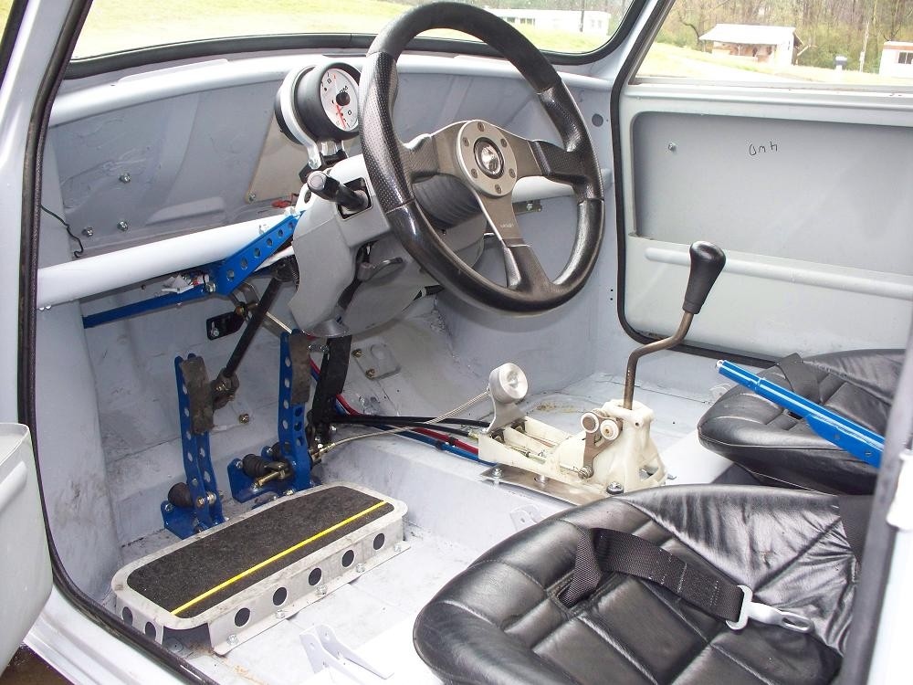 El habitáculo también se ha visto afectado por toda esta locura y se ha desnudado por completo hasta dejar el monocasco a la vista. Luego se ha instalado un sencillo volante, un bucket de carreras, un simple indicador de aguja para las revoluciones y un pedalier de carreras regulable.