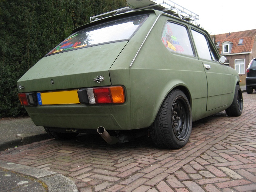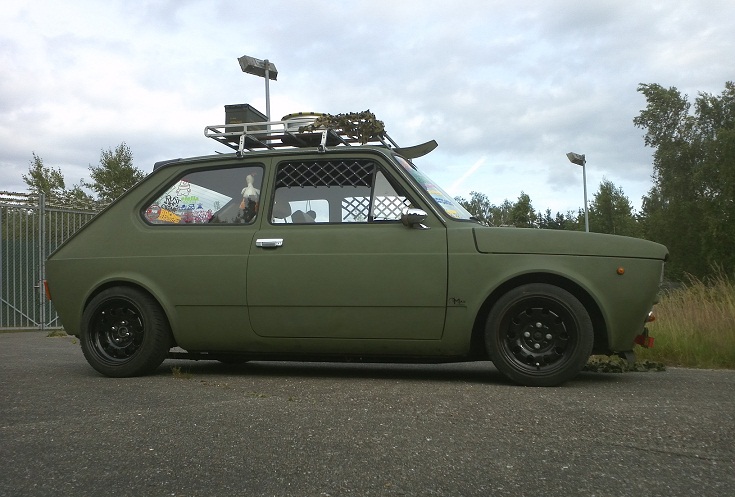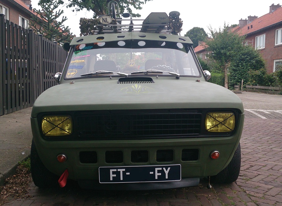 La creación recibe el nombre de 'CrazyDutch' FIAT 127 y aparece en la página web 'rat-look.com'. Apenas comenta nada sobre el proyecto, pero si muestra algunas imágenes del antes y del después y comenta que ha tardado mucho en dejarlo tal y como está.Yo personalmente no se que opinar. Hay ciertas cosas que me gustan, como los aletines ensanchados ligeramente, las llantas, la tremenda bajada de suspensión o la perdida de los paragolpes. Poro el color o la temática militar no me gustan nada, sobre todo con esa baca en el techo o en el interior, donde el pomo del selector del cambio es una aparatosa granada de mano de la 2ª Guerra Mundial, acompañada de un horripilante volante que resulta ser una cadena.