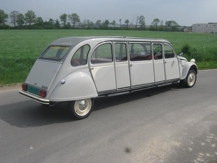 No es raro ver convertido en limusina casi cualquier coche del mercado, hay empresas especializadas en esos temas, pero convertir un Citroën 2CV en limusina ya es otro cantar