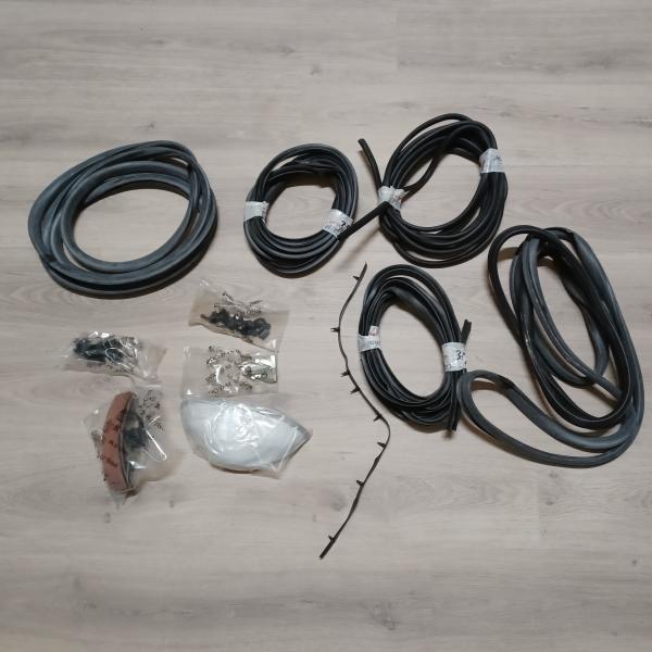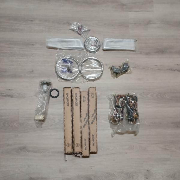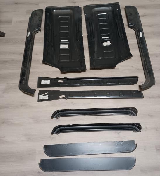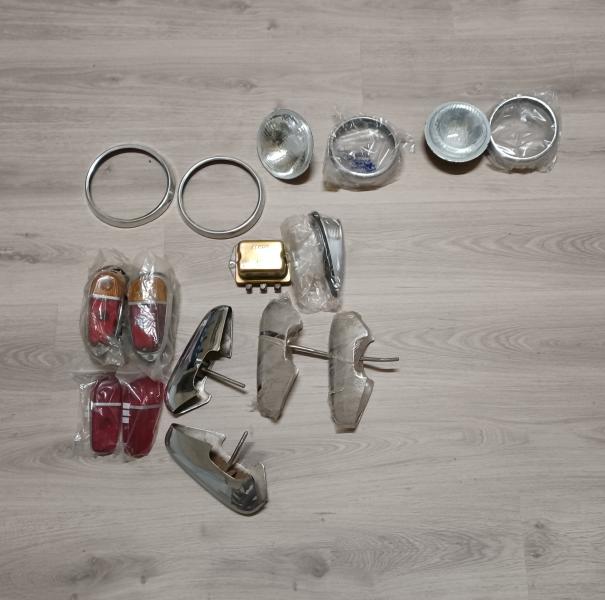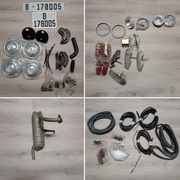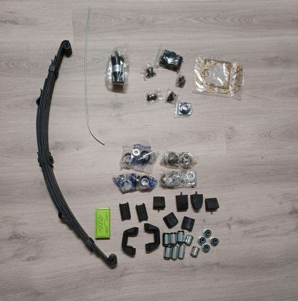 (Instalación eléctrica, 2 juegos de pilotos traseros, pilotos delanteros, ópticas, gocos y grapas, cerquillos completos, bigotera y escudos, aforador, radiador de montanya, goma de radiador, manguitos, 4 tapacubos y 5 juegos de grapas, 4 amortiguadores, ballesta, juegos de reparación para las manguetas, gomas de puerta, los 4 cojinetes de rueda, zapatas completas, bombines, latiguillos, bomba freno, piezas nuevas de chapa como los pisos, taloneras completas y bajos de puerta...)