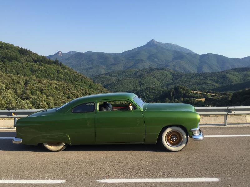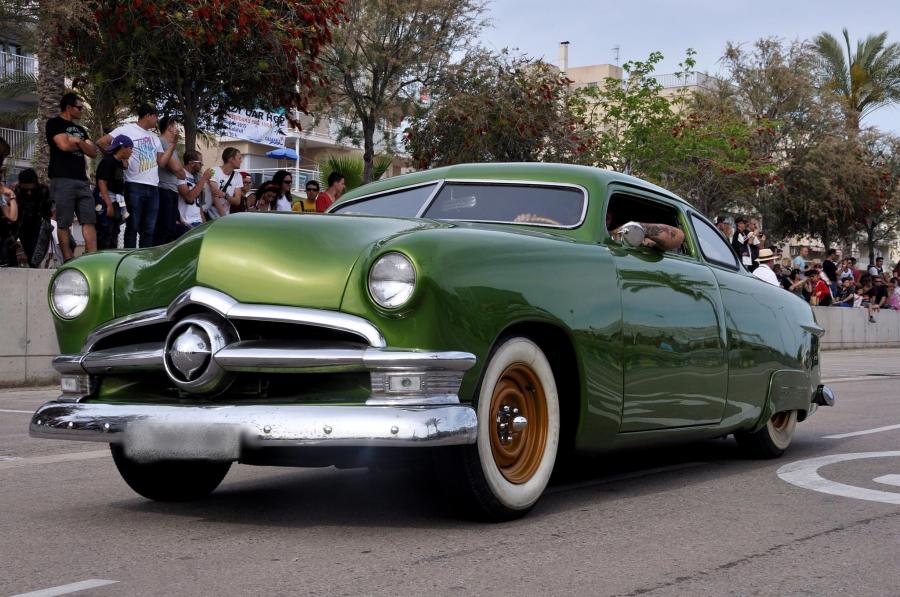 - 1949 Ford Shoebox Full Kustom Coupe for sale , Chopped , nosed , decked , shaved , lowered, Frenched lights, fenders skirt & custom paint.