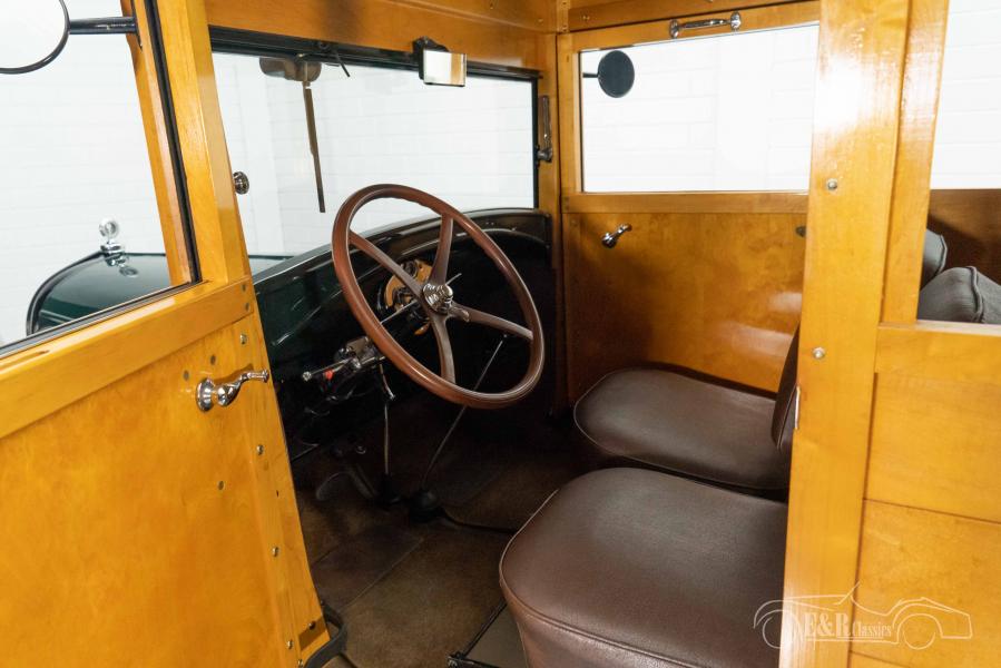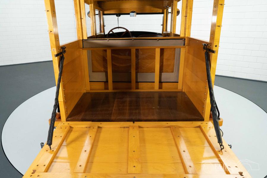 Un Ford Modelo A ya tiene una apariencia espectacular, y más aún un Woody. La carpintería de este clásico ha sido renovada y barnizada en el pasado y está en muy buenas condiciones. También tiene una pintura de dos tonos que está completamente en sintonía con un clásico de la década de 1920. Las ruedas de radios, la rueda de repuesto en el guardabarros y el techo de vinilo completan el conjunto. El interior está equipado con tapicería de cuero artificial marrón y ofrece espacio para 4 personas. Este Woody también tiene un portón trasero con un bonito acabado que ofrece mucho espacio para transportar cosas.