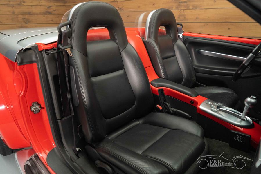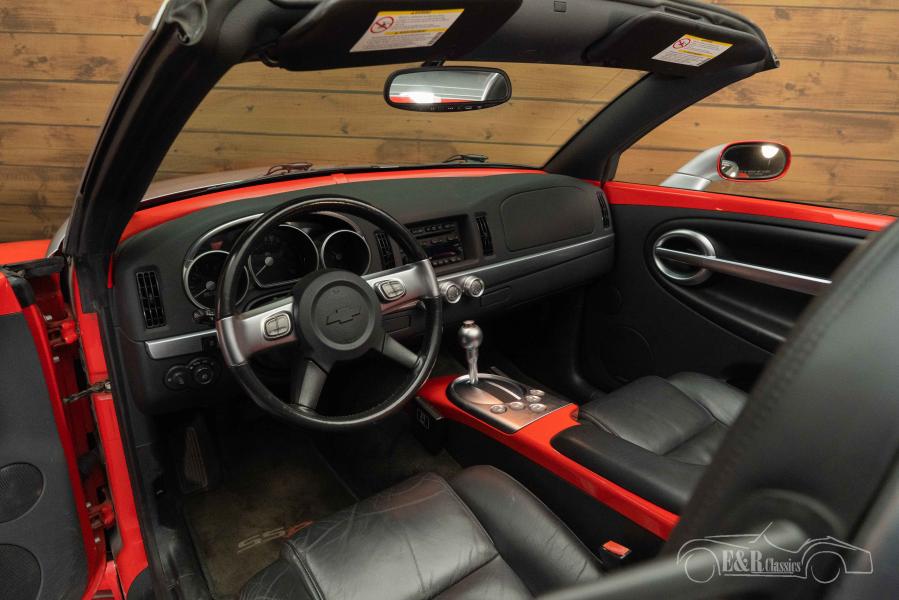 El Chevrolet SSR ya tiene una apariencia especial en sí mismo, pero su combinación de colores lo hace llamativo. Este SSR estaba originalmente pintado de rojo, pero el propietario anterior tenía la capota pintada de gris plateado, lo que le da al coche un carácter distintivo. Además, el Chevrolet está equipado con llantas de aleación originales que combinan con el aspecto deportivo del coche. La gran ventaja del SSR es, por supuesto, su techo rígido totalmente plegable. Con solo presionar un botón, puedes plegar fácilmente el techo para poder disfrutar del aire fresco mientras conduces. El interior está equipado con tapicería de cuero negro y está en estado original.