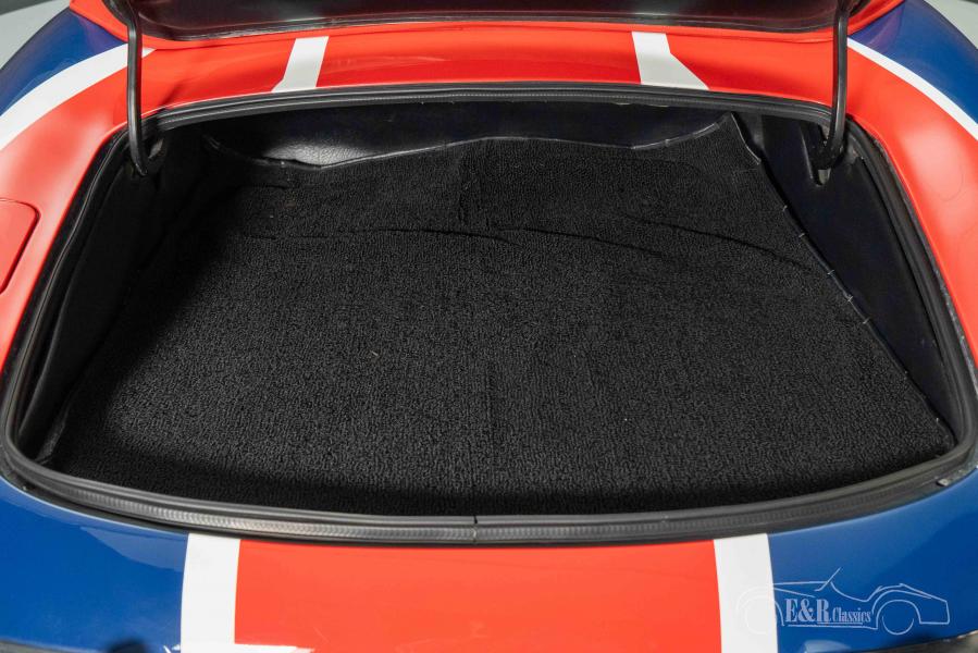 What makes this E-Type truly unique is the spectacular Union Jack paintwork. Not just any sticker, but applied by hand by a craftsman, so that every detail comes into its own perfectly. The paintwork is enhanced by the contrasting red soft top and the elegant two-tone interior, which exudes luxury and nostalgia. Chrome-plated spoke wheels and a wooden sports steering wheel complete the classic look.
