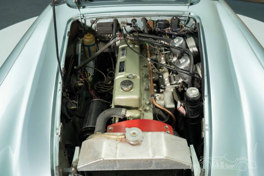 The elegant Ice Blue and Old English White paintwork exudes class and authenticity, while the chrome spoke wheels, luggage rack and badge bar enhance the classic look. The dark blue soft top fits perfectly with the luxurious interior, where a wooden Moto Lita sports steering wheel completes the atmosphere of a real British roadster. This Austin-Healey is a unique combination of style, history and driving pleasure, ready to be admired and driven.