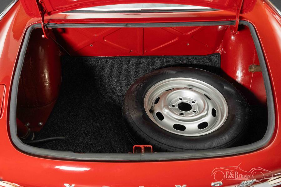 The exterior of this Volvo P1800 is finished in its original colour Red, which fits perfectly with the classic lines and chrome accents of the car. The characteristic grille and elegant bumpers emphasize the sporty yet elegant appearance. The red steel rims with chrome hubcaps complete the whole. The interior exudes pure classic atmosphere with the black leather interior, a beautiful Jensen rear seat and the original dashboard with aluminum finish and classic meters. The combination of the deep red paintwork and the chic black interior gives this Volvo a timeless look that makes it an absolute rarity in the world of classic cars.