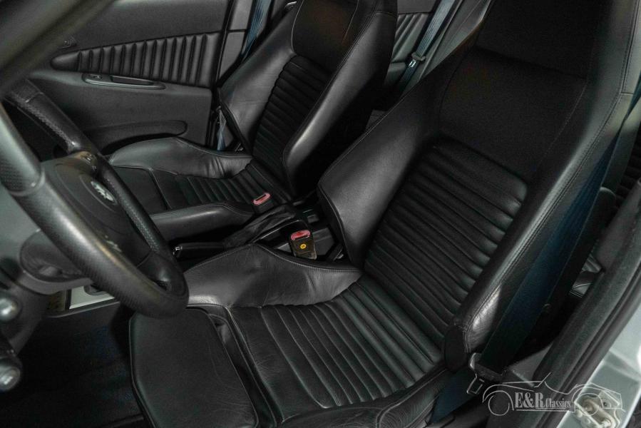 La pintura gris plata está en buen estado y realza las líneas agresivas del GTA, con sus característicos pasos de rueda extendidos y faldones deportivos. Las llantas originales "Teledial" de 17 pulgadas, combinadas con pinzas de freno rojas, completan el conjunto. En el interior, el interior de cuero negro ofrece un ambiente lujoso y deportivo, con asientos deportivos de formas perfectas y detalles de aluminio. La combinación de materiales refinados y el elegante exterior hacen de este excepcional 156 GTA Sportwagon un valioso clásico para el futuro.